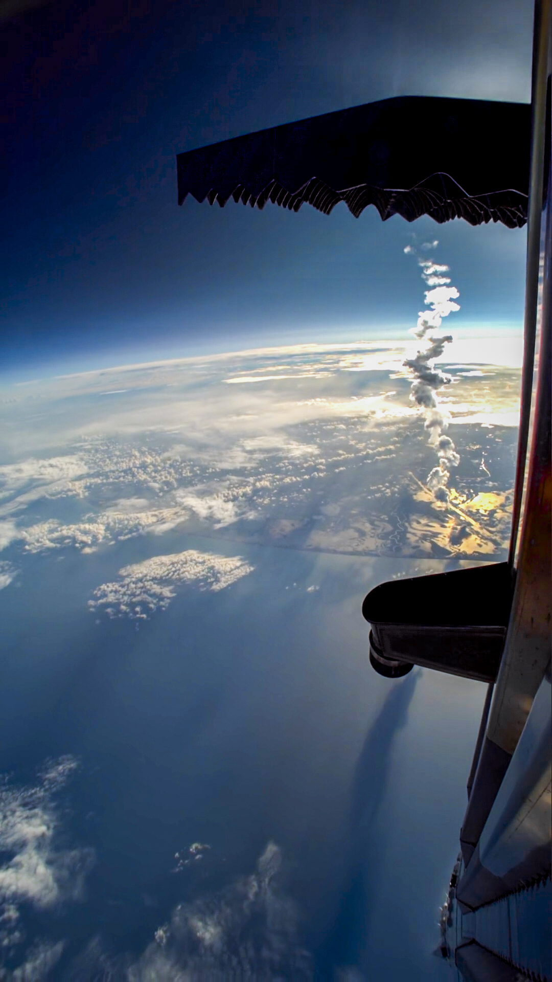 On voit aussi les conséquences de la rentrée atmosphérique du véhicule lors de sa redescente sur Terre. La gerbe de couleur rose s’avère être du plasma : c’est le résultat du contact de l’air avec le vaisseau filant à toute vitesse. L’air est compressé et chauffé, ce qui perturbe les molécules et engendre ce gaz très chaud et lumineux.