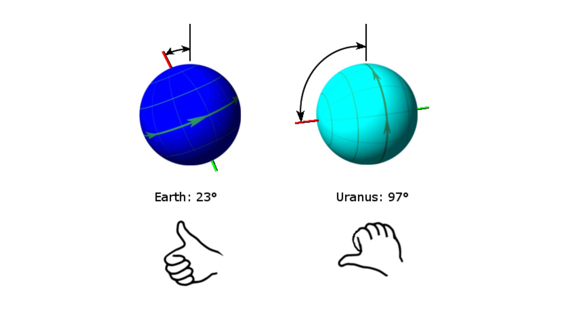 L’axe de rotation d’Uranus est incliné à 97,8° par rapport à son plan orbital (le plan dans lequel elle tourne autour du Soleil). Les raisons de cet axe presque complètement horizontal sont encore inconnues des scientifiques.