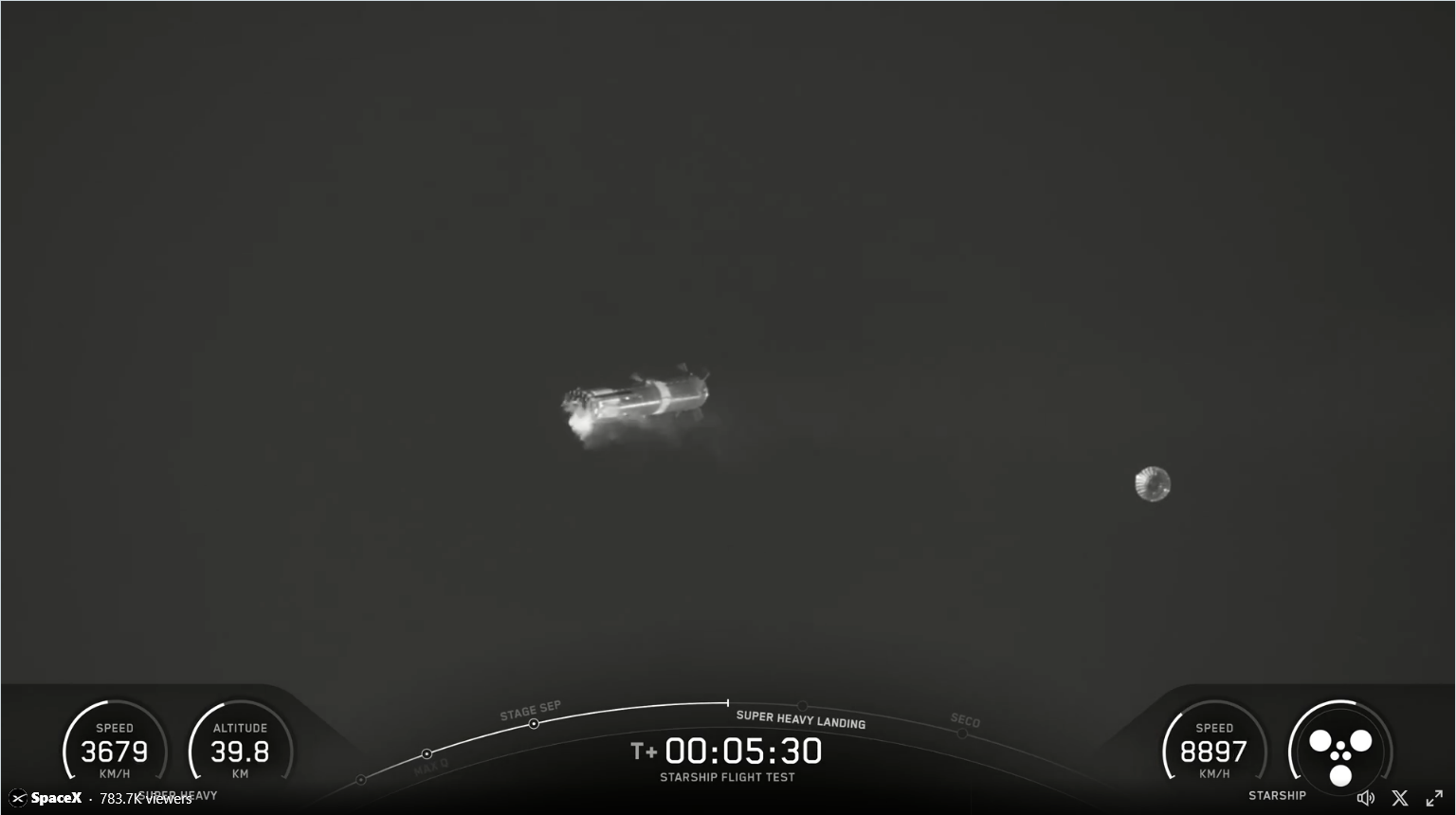 Forcément un peu frustrante pour les fans de conquête spatiale, l’absence de cette pirouette aérienne — déjà exécutée à trois reprises dans la carrière du Starship — a été quelque peu compensée par une confirmation : celle de la réussite de la réutilisation d’un propulseur Super Heavy lors d’un second vol. C’est la deuxième fois que ce test est réussi, sur deux.