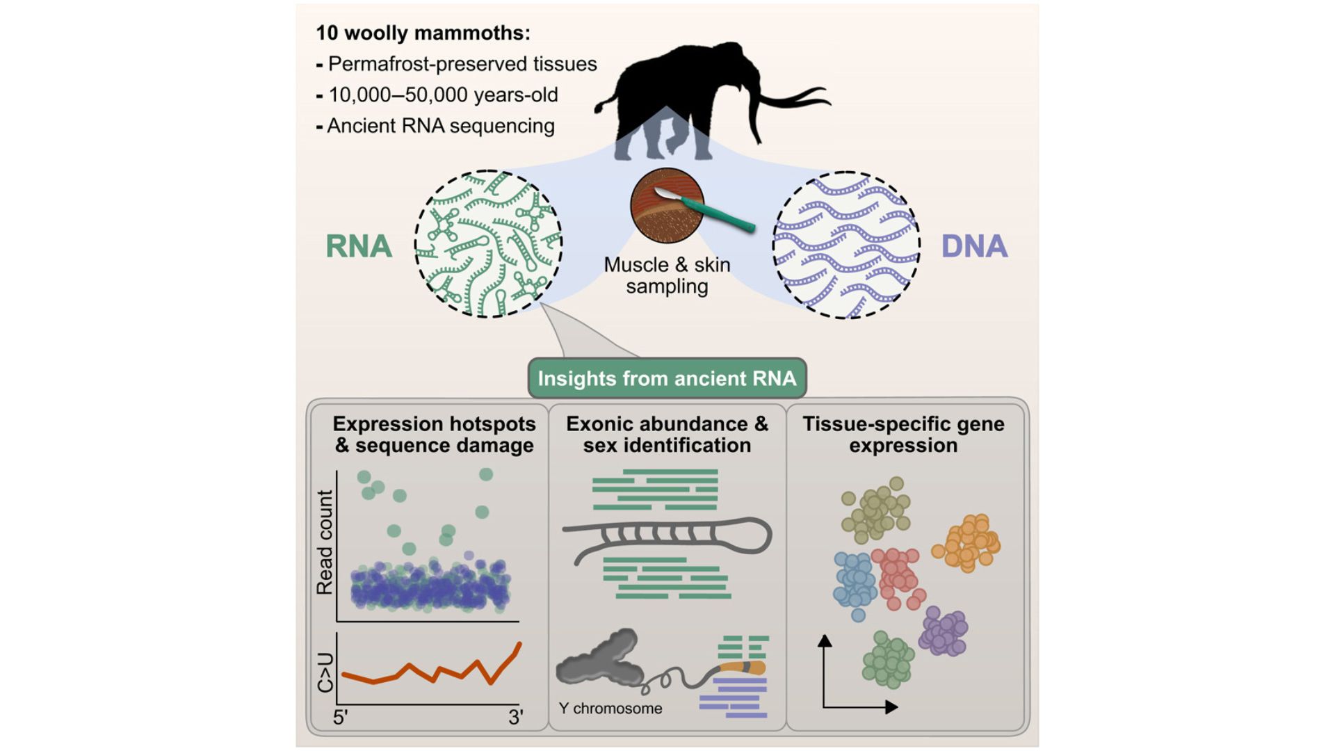 L’ARN étudié provient des restes musculaires d’un jeune mammouth, nommé Yuka, retrouvés dans le pergisol en Sibérie et datant de l’ère glaciaire. Il codait pour des protéines participant à la contraction musculaire et à la régulation des mécanismes du corps qui s’adapte aux situations de stress.