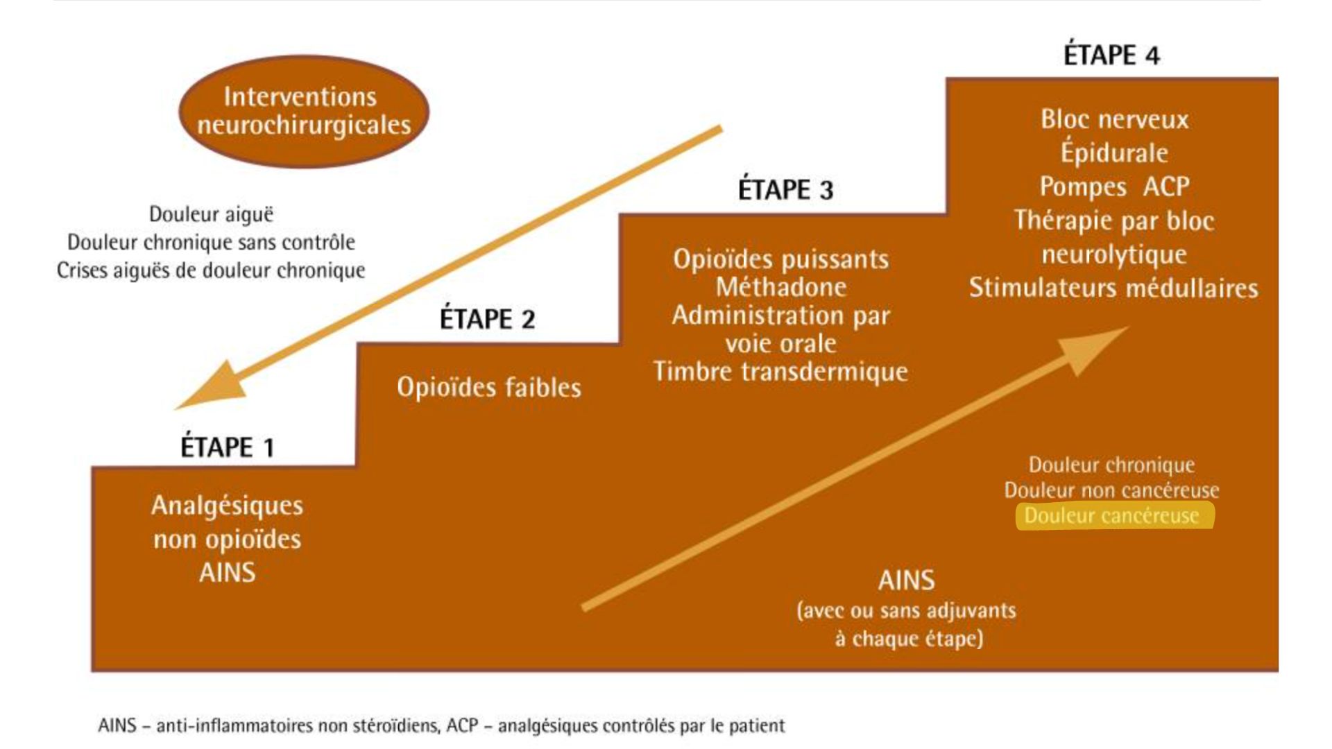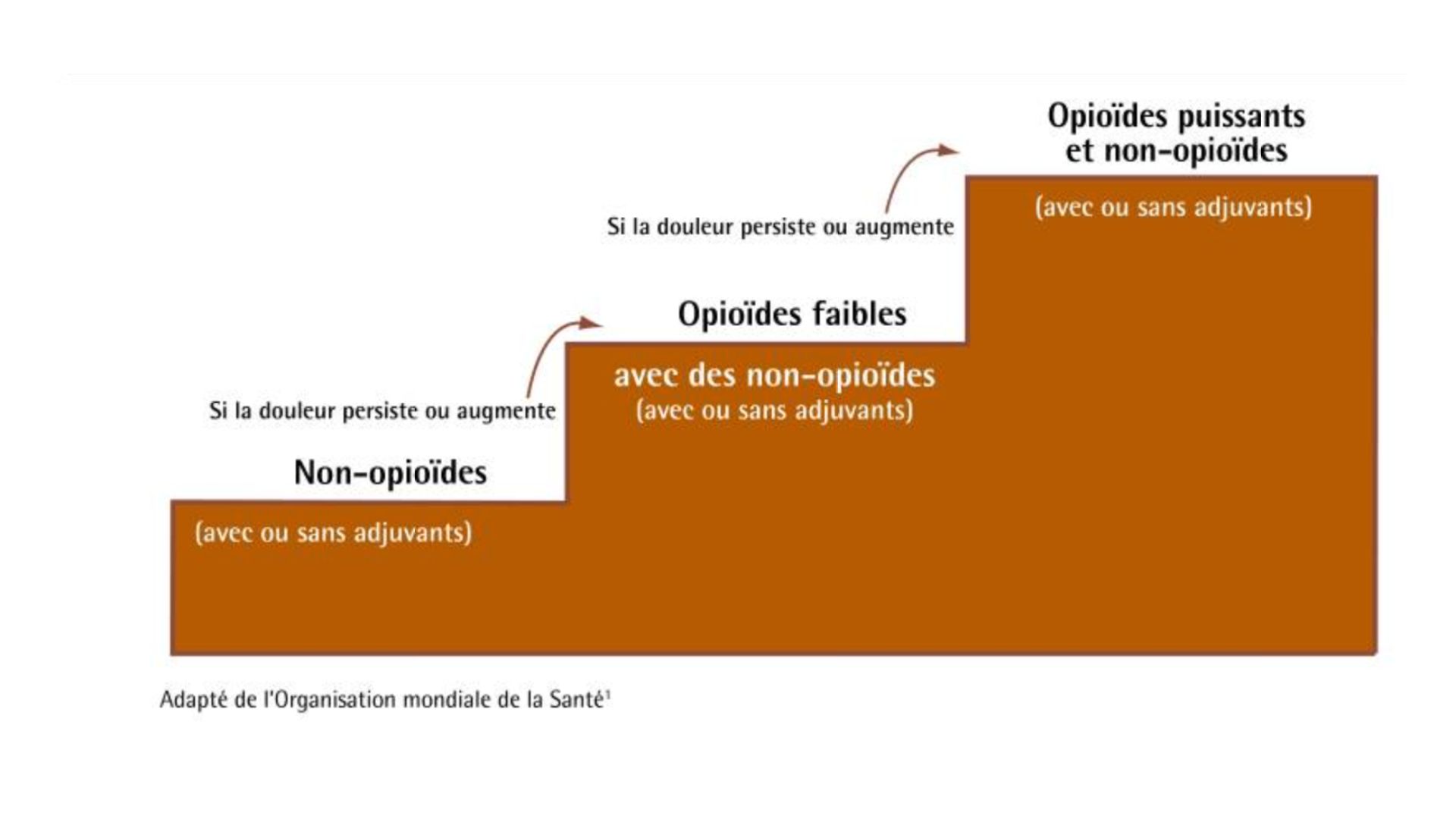 Cependant, les anciens concepts ont la vie dure au sein du corps médical. La preuve : encore actuellement, l’échelle de douleur de l’OMS, comprenant plusieurs paliers, est enseignée dans les facultés aux jeunes médecins alors que l’OMS elle-même y a mis fin en 2018 dans les douleurs du cancer.