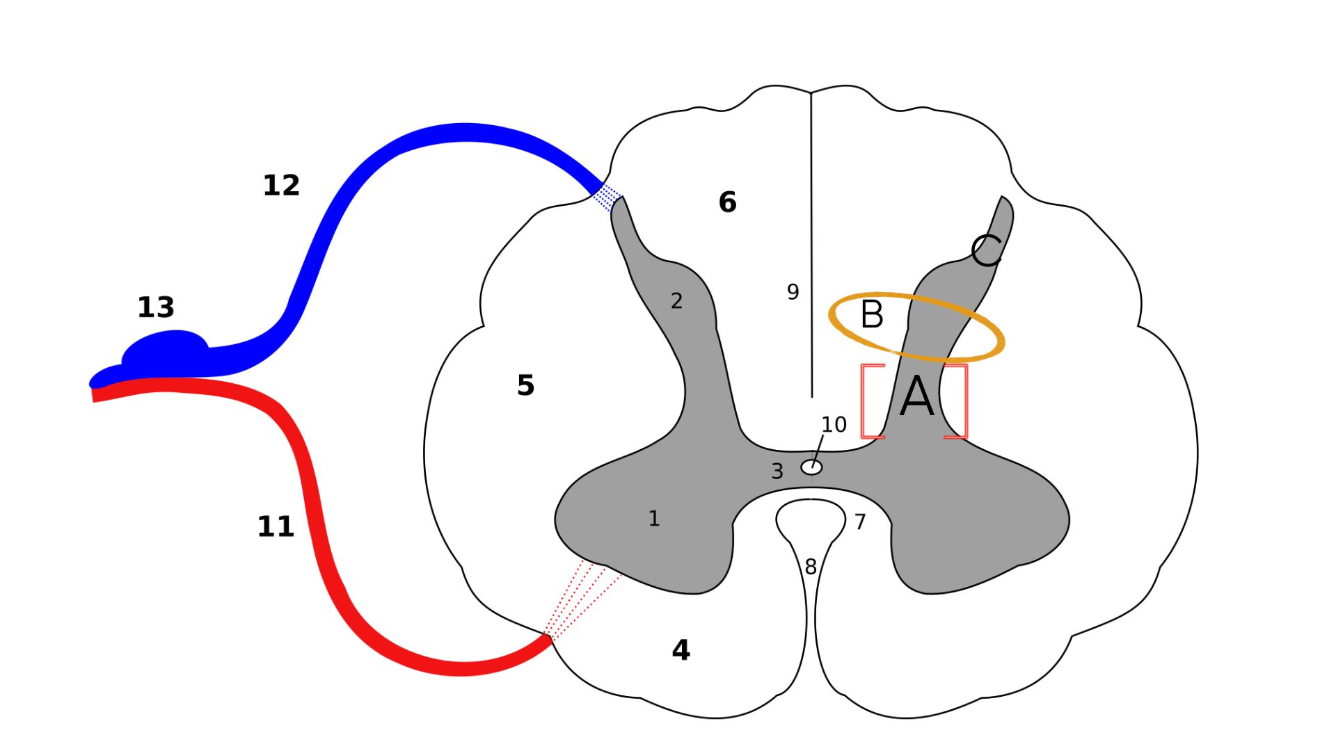 La moelle épinière est divisée en plusieurs couches qui transportent par différents circuits tous les types de signaux qui nous arrivent de l’extérieur par notre système nerveux périphérique vers notre cerveau.