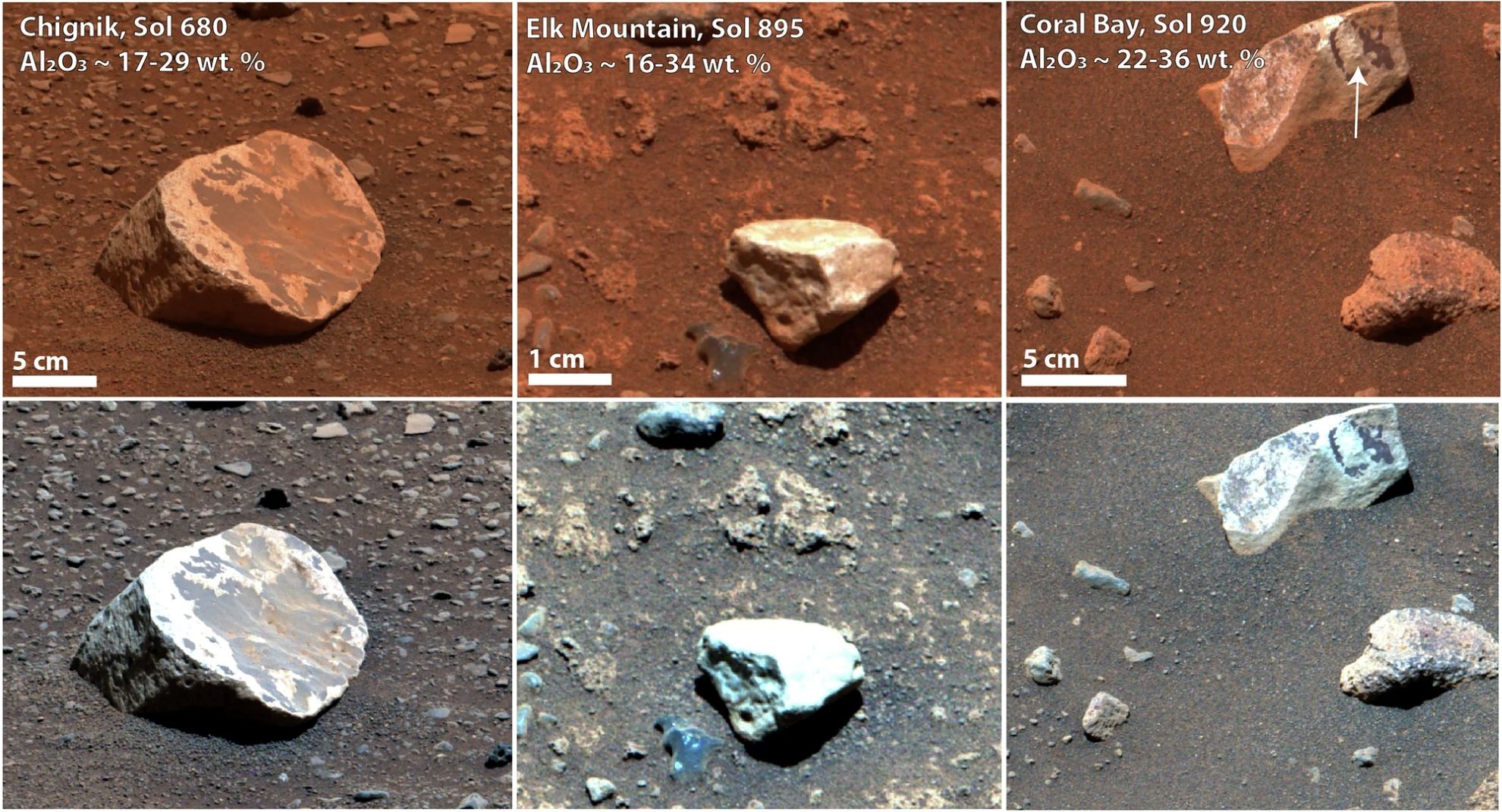 Les fragments de kaolinite trouvés sur Mars ont d’ailleurs été comparés à des fragments prélevés en Afrique du Sud et à San Diego, aux États-Unis, suggérant des formations similaires.