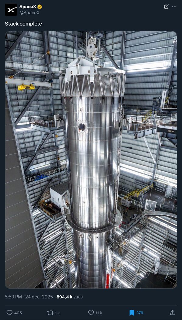 Pour les fans de vol spatial, c’était un cadeau de Noël avant l’heure. Et un soulagement à la fois pour la NASA et le programme Starship. Dans un message paru le 24 décembre, SpaceX a partagé sur X une photo du Super Heavy dressé dans son hangar d’assemblage, accompagné d’une légende laconique, mais victorieuse : « stack complete ».