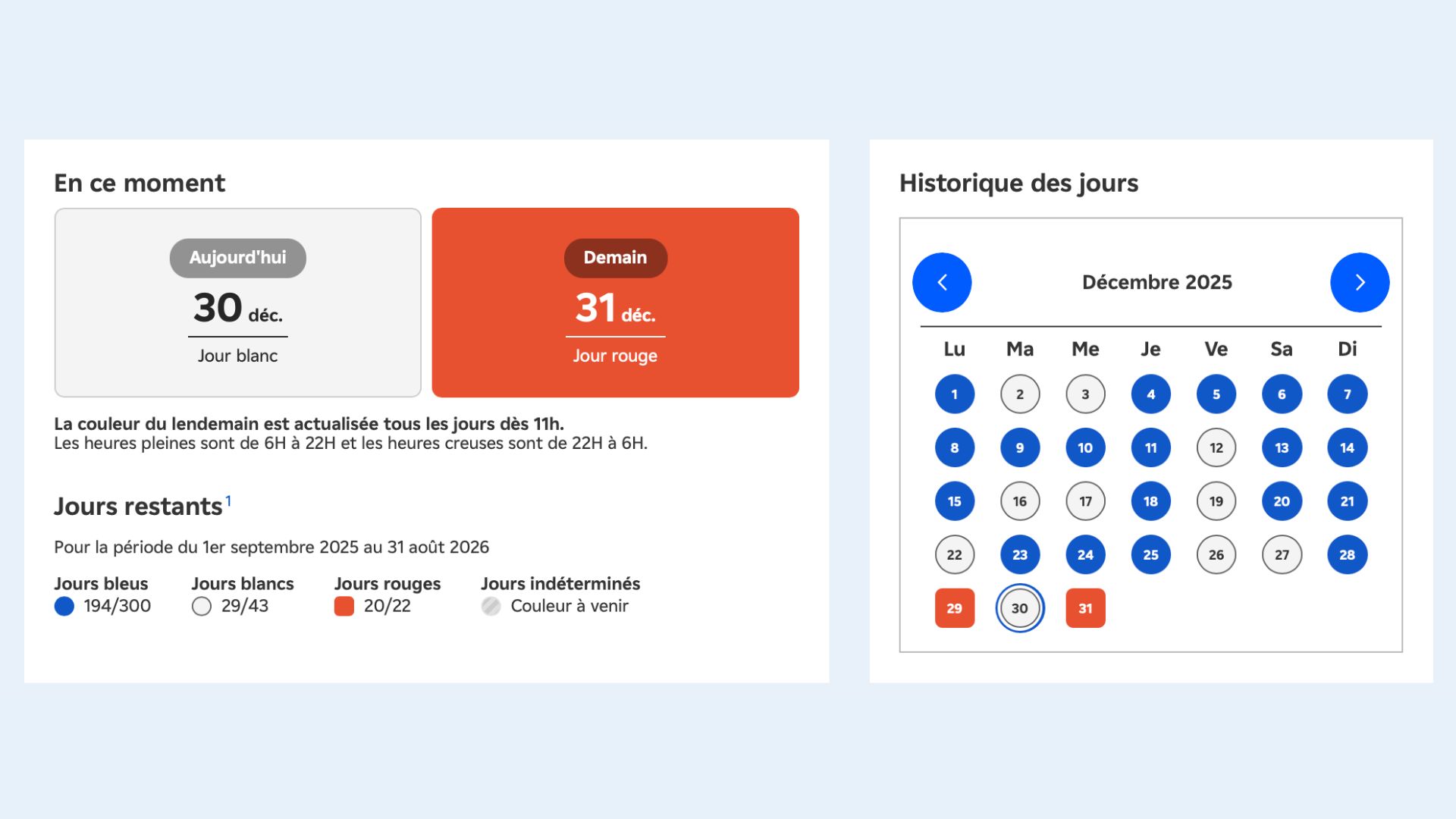 Le 31 décembre 2025 sera par conséquent le deuxième jour rouge de cet hiver, le premier étant tombé le 29 décembre — il restera ensuite 20 jours rouges jusqu’au 31 mars 2026. Les abonnés au contrat avaient été épargnés avec un jour bleu pour le 24 décembre, mais le réveillon du 31 décembre leur coûtera inévitablement plus cher, surtout s’ils l’organisent chez eux.