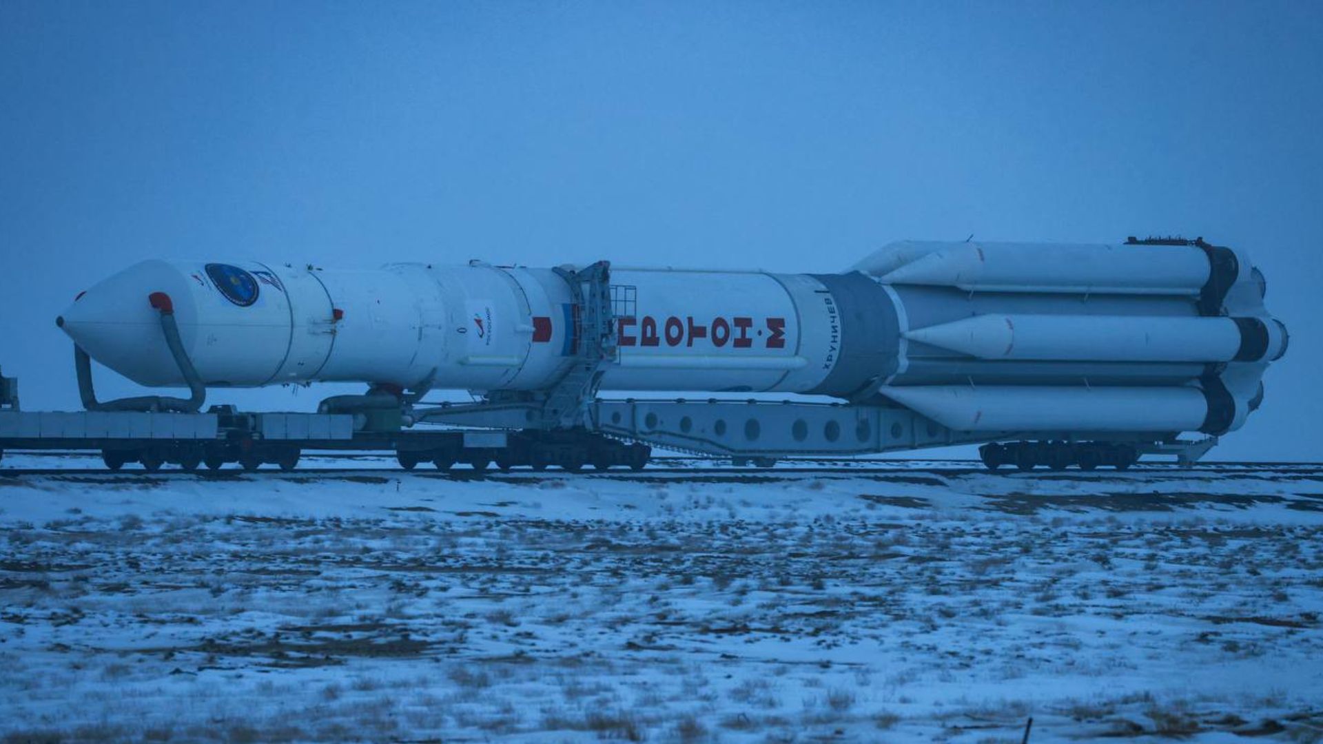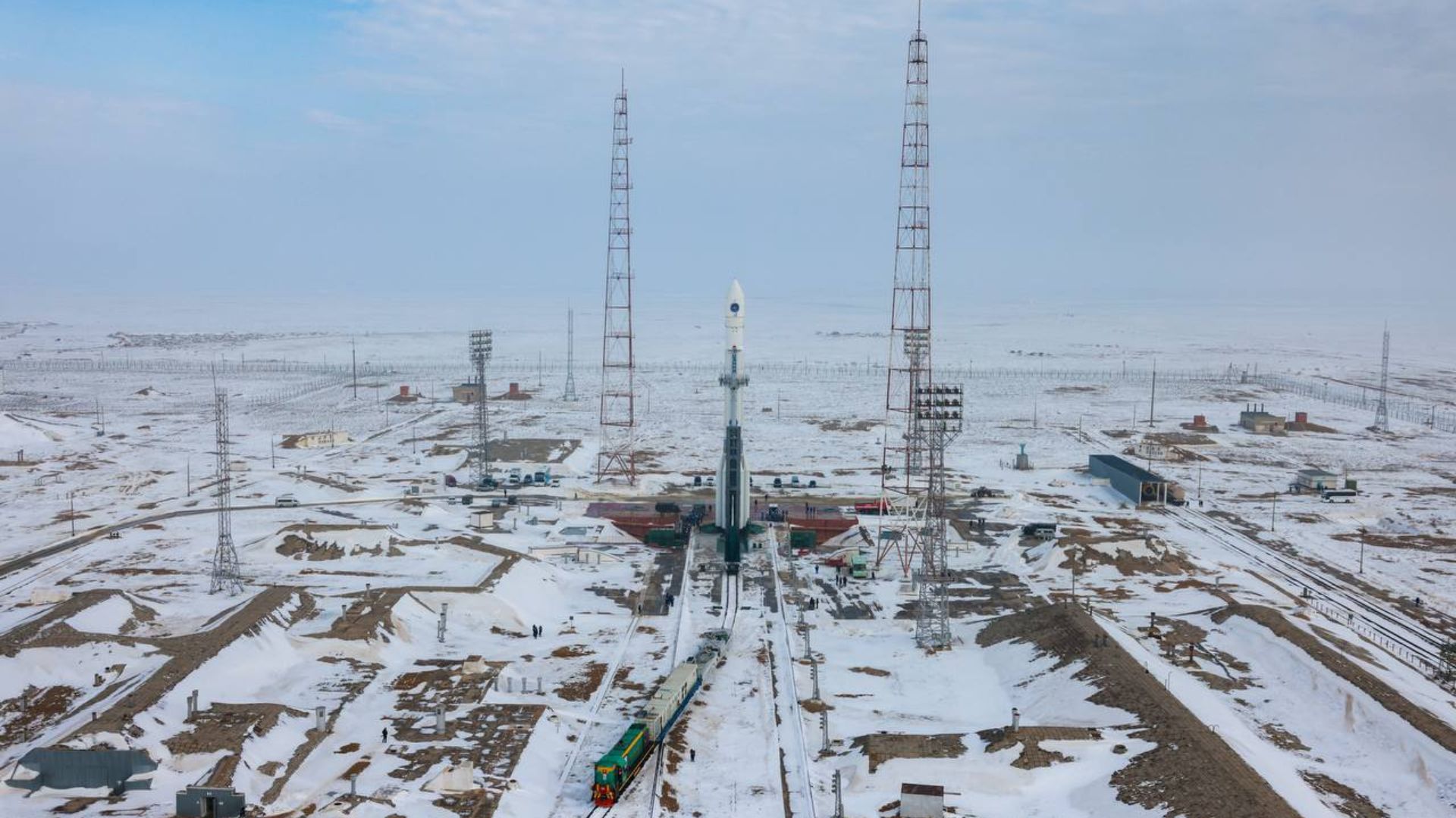 Voilà sans doute une image que l’agence spatiale russe désirait montrer depuis quelques mois : celle d’un cosmodrome de Baïkonour tout à fait opérationnel, s’apprêtant à accueillir le lancement imminent d’une fusée : le lanceur lourd Proton-M. L’engin est d’ailleurs d’ores et déjà dressé sur son pas de tir, dans la steppe hivernale du Kazakhstan.