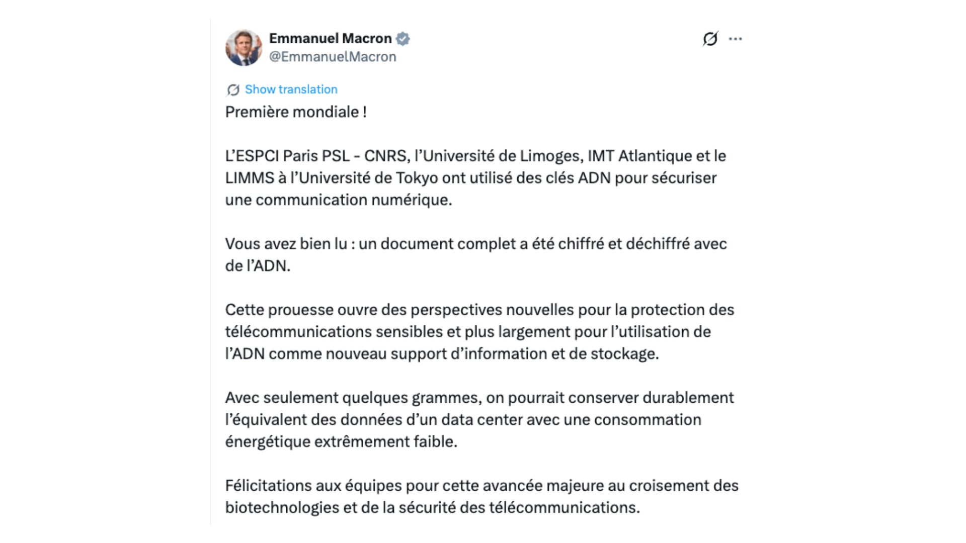 Cette démonstration est prometteuse. À l’occasion de la visite d’Emmanuel Macron au Japon, une équipe franco-japonaise de scientifiques a montré, pour la première fois en conditions réelles, une méthode cryptographique utilisant l’ADN comme support. Le président évoque une « première mondiale » dans un message publié sur X le 1er avril 2026.