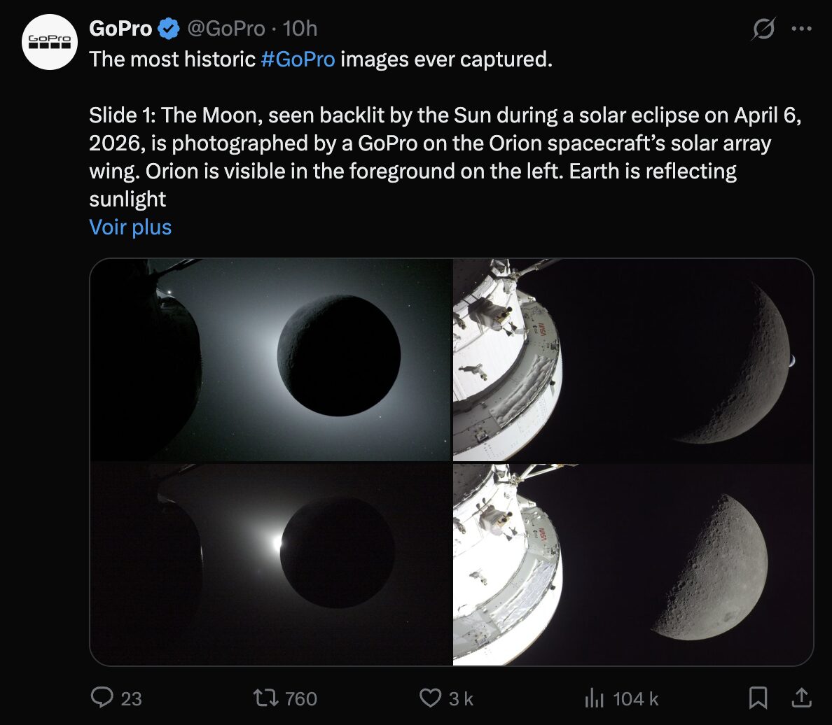 La majorité des images de la mission publiées sur le site de la Nasa sont photographiées avec un Nikon D5, mais deux autres appareils sortent du lot : l’iPhone 17 Pro Max et… une GoPro HERO4 Black suspendue à la capsule Orion. L’entreprise américaine, qui traverse une période de crise avec une concurrence chinoise de plus en plus féroce, s’est félicitée sur Twitter de ces images historiques. Jamais une GoPro n’est allée aussi loin dans l’espace.