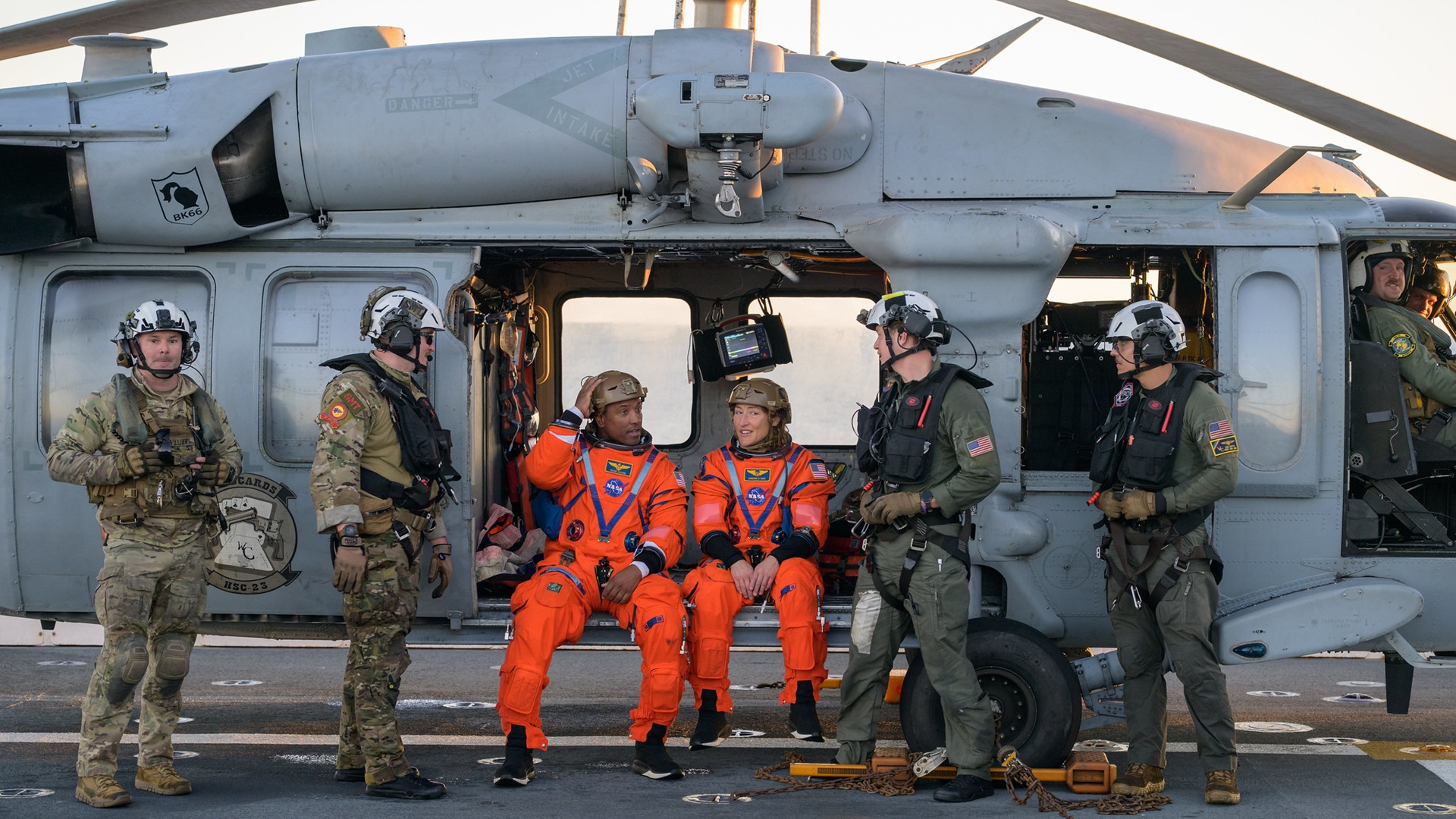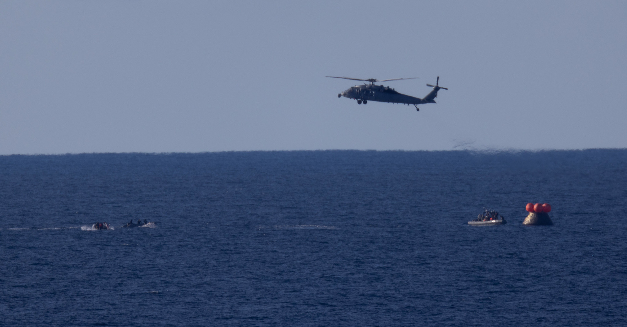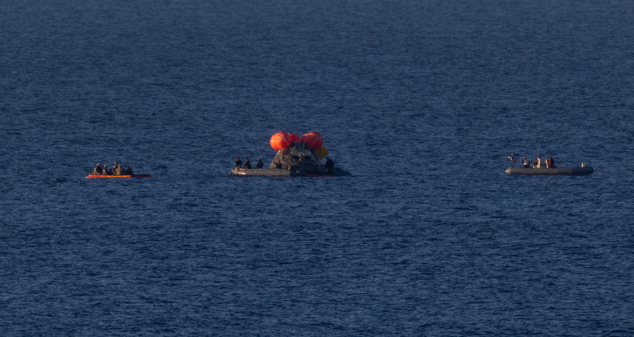 Juste après la traversée atmosphérique, la capsule Orion a fini sa course dans l’océan Pacifique, où des moyens conséquents de l’US Navy avaient été déployés pour récupérer l’équipage. L’engin a pu être sécurisé par les plongeurs de la Marine et les quatre astronautes extraits puis transportés par hélicoptère jusqu’à un navire.