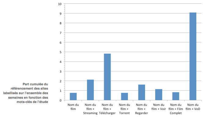 Ce cumul des résultats est néanmoins à la peine face à l'écrasante place prise par les sites "manifestement illicites" dans certaines recherches. Sur la requête "nom du film + streaming", ils occupent 66,26 % des premiers résultats. Ce pourcentage atteint 59,73 % pour "nom du film + télécharger",85,58 % pour "nom du film + torrent" et 45,05 % pour "nom du film + regarder".