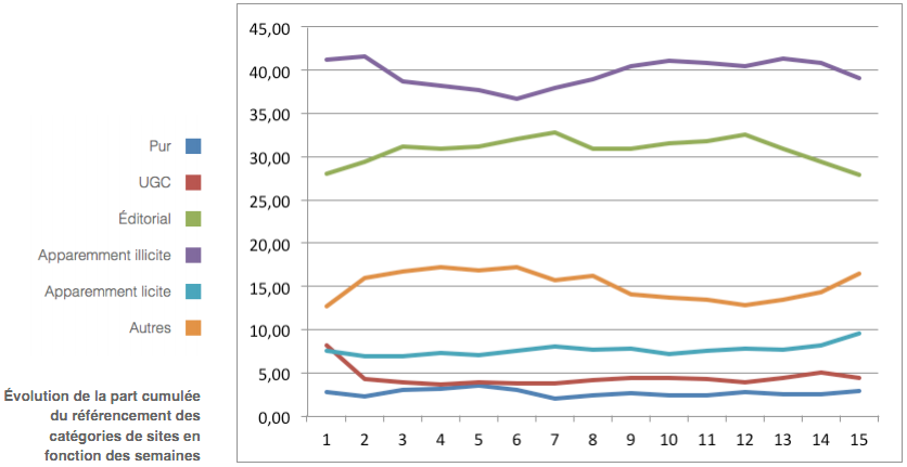 C'est peu de le dire. Le rapport relève que "sur les deux moteurs considérés et sur l'ensemble des requêtes analysées en 15 semaines, les sites labellisés représentent 3 % des premières réponses". Tout le reste concerne l'offre non labellisée, catégorie fourre-tout rassemblant aussi bien les sites "apparemment illicites" que les plateformes "apparemment licites", ainsi que tous les autres espaces référencés.