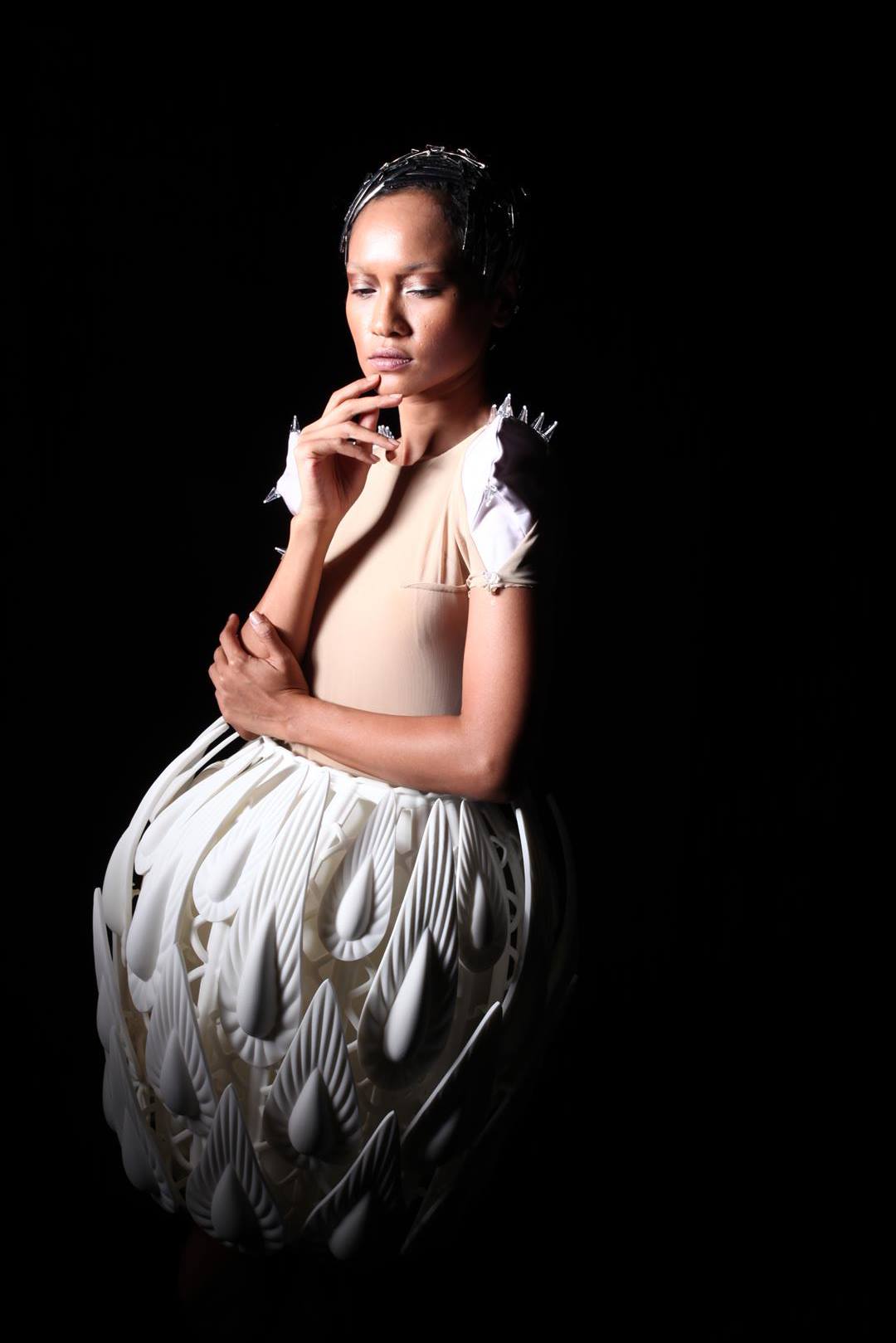 L'artiste a ainsi créé cinq modèles. Une coiffe, des chaussures, un collier, une cape, et une jupe. Le tout était présenté en partenariat avec la société belge Materialise, qui s'est spécialisée dans l'impression 3D. L'histoire ne dit pas si les vêtements imprimés étaient agréables à porter — ce qui n'est de toute façon que rarement le cas avec la "haute couture".