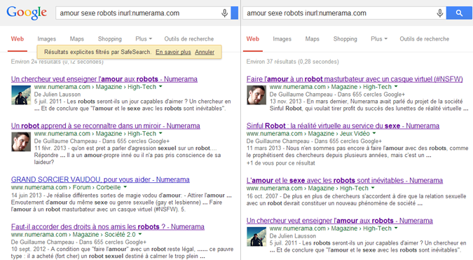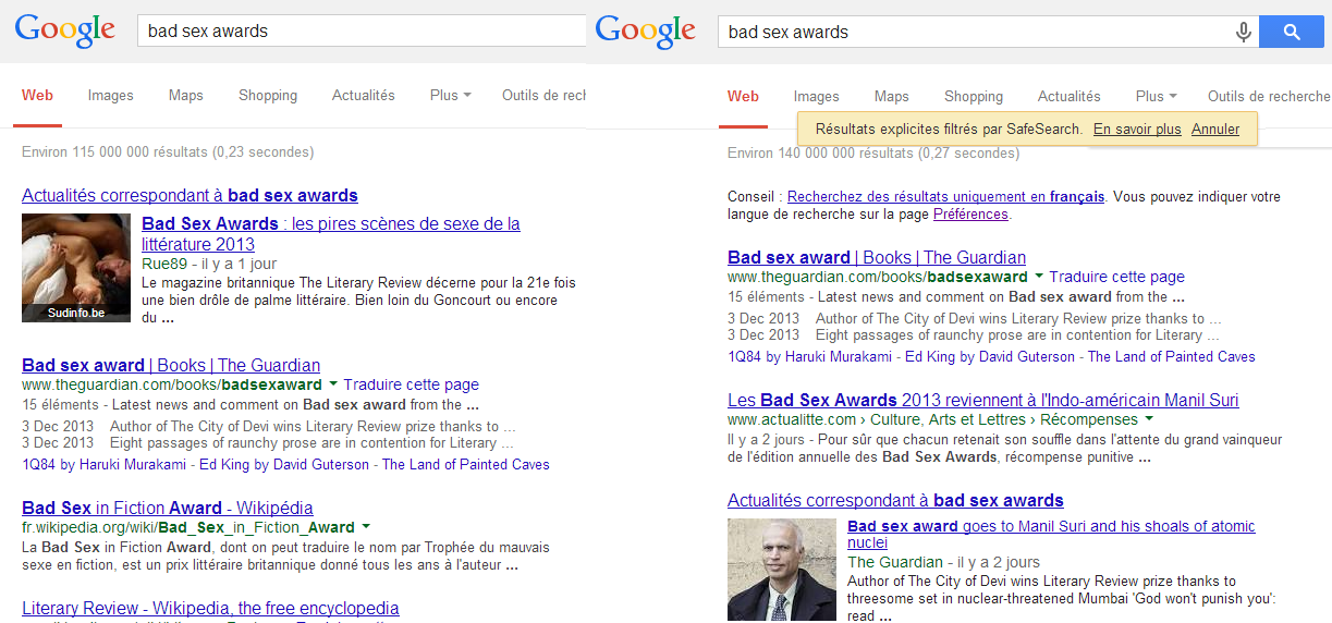 Ainsi par exemple, lorsque SafeSearch est activé, cet article de Rue89 sur la remise des Bad Sex Awards est censuré. Aux yeux du très prude Google, le journal numérique a le tort de citer des passages explicites de la littérature érotique. En revanche, Actualitté qui fait preuve de plus de pudeur est bien classé dans les résultats après censure :