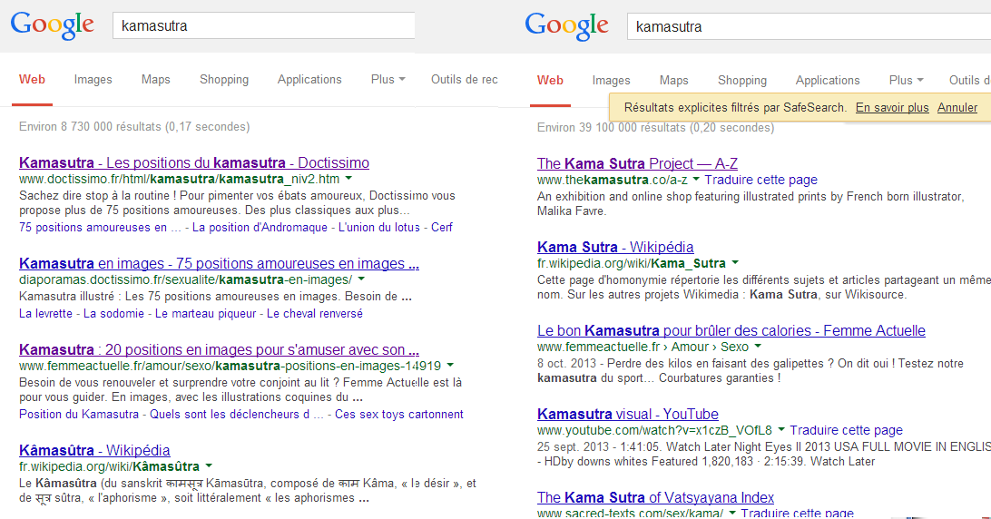 Autre exemple. Si vous recherchez le "Kamasutra", c'est cet article de Doctissimo qui arrive en tête pour présenter les positions sexuelles, avec force détails. Le 3ème résultat est cet article de Femme Actuelle. Probablement le type d'articles que l'on trouverait en kiosque dans la version en papier glacé. Mais dès que SafeSearch est activé, ce qui sera un jour le cas pour tous les utilisateurs de Google, les deux liens précités disparaissent, et c'est un projet artistique qui arrive en tête :