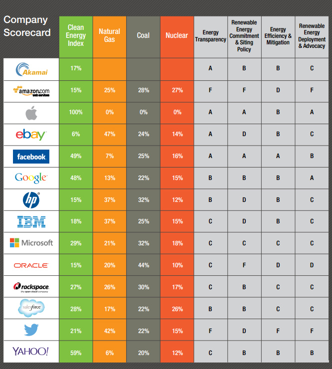 Six acteurs importants du cloud (Apple, Box, Facebook, Rackspace, Google et Salesforce) ont annoncé leur objectif d'utiliser 100 % d'énergie renouvelable pour alimenter leurs serveurs. Greenpeace a salué ces annonces, et estime qu'elles sont déjà accompagnées de réalisations concrètes qui permettent de croire qu'elle sera respectée. C'est aussi l'intérêt économique de ces entreprises, qui paieront moins chère une énergie renouvelée naturellement.