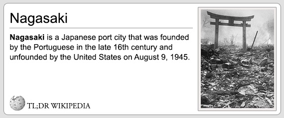 Un exemple ? L'article consacré à Nagasaki est présenté ainsi : "Nagasaki est une cité portuaire japonaise qui a été bâtie par les Portugais à la fin du 16ème siècle et qui a été déconstruite par les États-Unis le 9 août 1945".