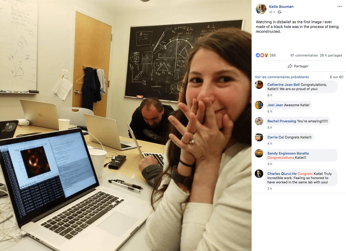 Alors que l’image historique venait d’être dévoilée, la scientifique a publié une photo sur Facebook. La scène se passe il y a quelques mois. Katie Bouman découvre l’image du trou noir, en train d’être reconstituée grâce à l’algorithme CHIRP (« Continuous High-Résolution Image Reconstruction using Patch priors ») qu’elle a inventé.