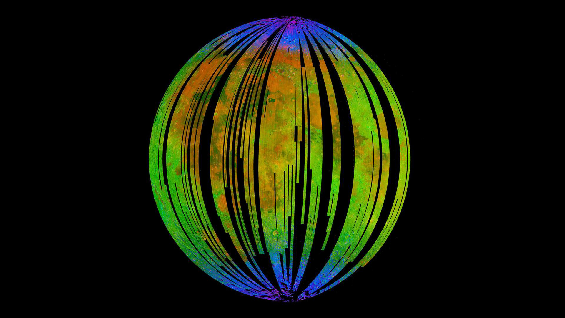 Ce minéral a été détecté sur la Lune grâce aux données de Chandrayaan-1, une sonde de l’Organisation indienne pour la recherche spatiale (ISRO), qui s’est placée en orbite autour de l’astre en 2008. Les scientifiques ont malheureusement perdu contact avec le vaisseau 9 mois plus tard, mais la mission n’a pas été vaine : elle a permis de collecter de précieuses données, dont la présence d’eau glacée. À son bord, la sonde embarquait l’instrument baptisé Moon Mineralogy Mapper, ou M3, un spectromètre fourni par l’Agence spatiale américaine (Nasa). La carte ci-dessus est issue des données de cet instrument. M3 a pu repérer les zones où la lumière était réfléchie en surface sur la Lune, et voir que les pôles de l’astre avaient une composition particulière.