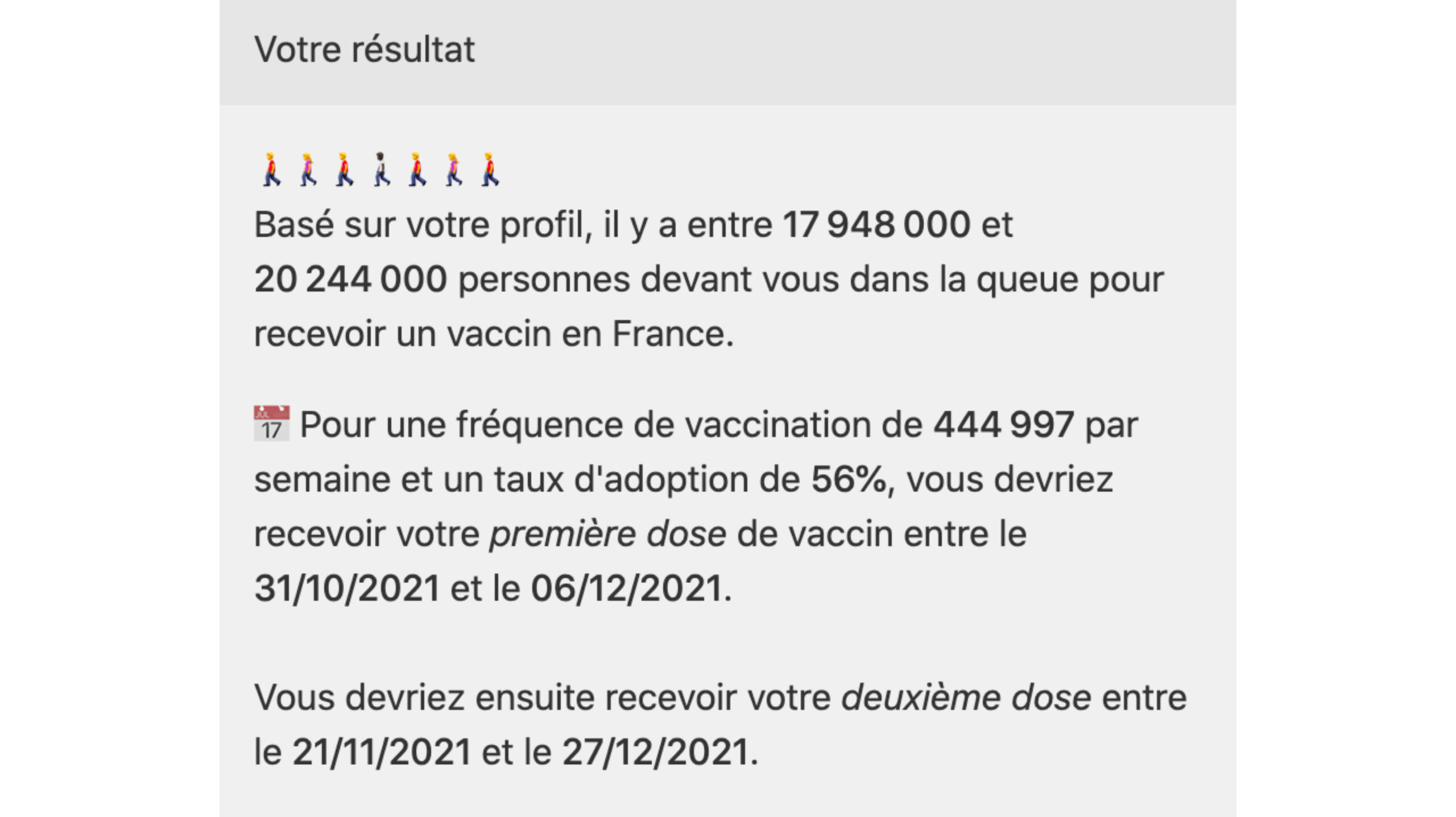 « Pour une fréquence de vaccination de 444 997 par semaine et un taux d’adoption de 56%, vous devriez recevoir votre première dose de vaccin entre le 31/10/2021 et le 06/12/2021. Vous devriez ensuite recevoir votre deuxième dose entre le 21/11/2021 et le 27/12/2021 ». Si vous avez 75 ans et plusieurs conditions médicales, vous pourrez vous faire vacciner dès le mois d’avril, estime le calculateur, même si vous ne vivez pas en EHPAD. Par contre, si vous avez 21 ans, que vous êtes en pleine santé et que vous ne travaillez pas dans le domaine médical, vous ne serez certainement pas vacciné avant 2022.