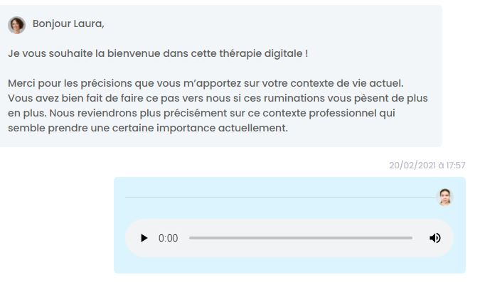 De mon côté, les échanges avec la psychologue débutent plutôt bien. Elle me présente son fonctionnement et m’invite à me dévoiler. Les jours passent et nos échanges sont plus nombreux, plus profonds. Finalement, l’écriture me permet de structurer ma pensée et d’aborder des sujets que je n’aurai pas osé évoquer à l’oral. Je ne me sens pas prise au piège et je peux couper la conversation à tout moment. De plus, ma psychologue me fait parvenir de nombreux messages audio chaque jour et c’est agréable, je me sens réellement soutenue. Seul bémol : le temps est limité à 2 minutes par message vocal.