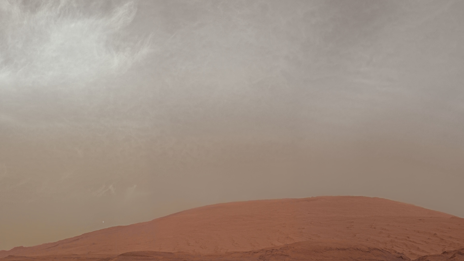 Le mont Sharp vu par Curiosity. On distingue aussi la lune Phobos.