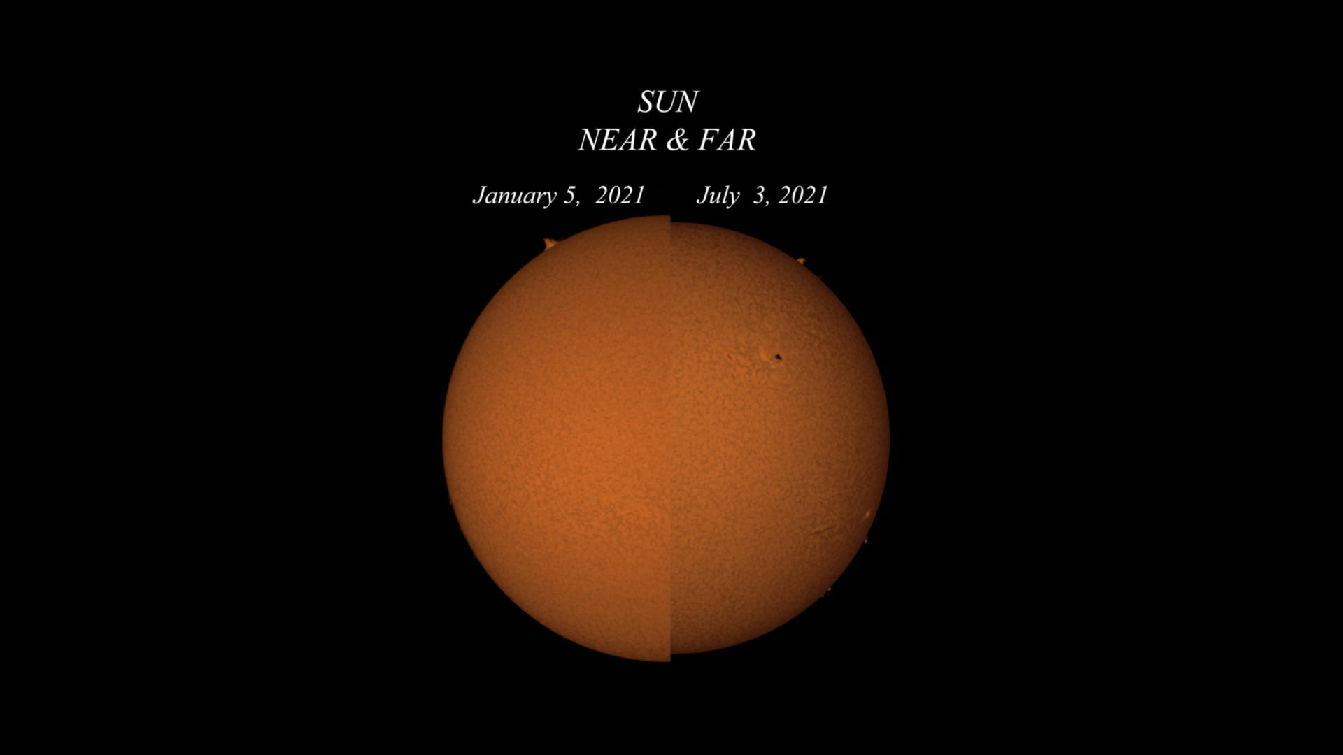 Cette image a été obtenue par Richard Jaworski. Il s’agit en fait d’un assemblage de deux photographies du Soleil, prises à deux moments différents de l’année. On voit nettement que le 5 janvier puis le 3 juillet 2021, le diamètre apparent de l’étoile a légèrement changé. Cette différence s’explique en fait par la mécanique spatiale, lorsque la Terre se trouve au périhélie par rapport au Soleil, puis à son aphélie.