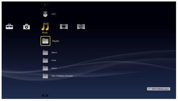 Les prochains ordinateurs portables de la série Vaio FW seront équipés du logiciel Vaio Media+, qui utilise la même interface qui permet de de se déplacer horizontalement entre les catégories, et verticalement entre les contenus/options disponibles.