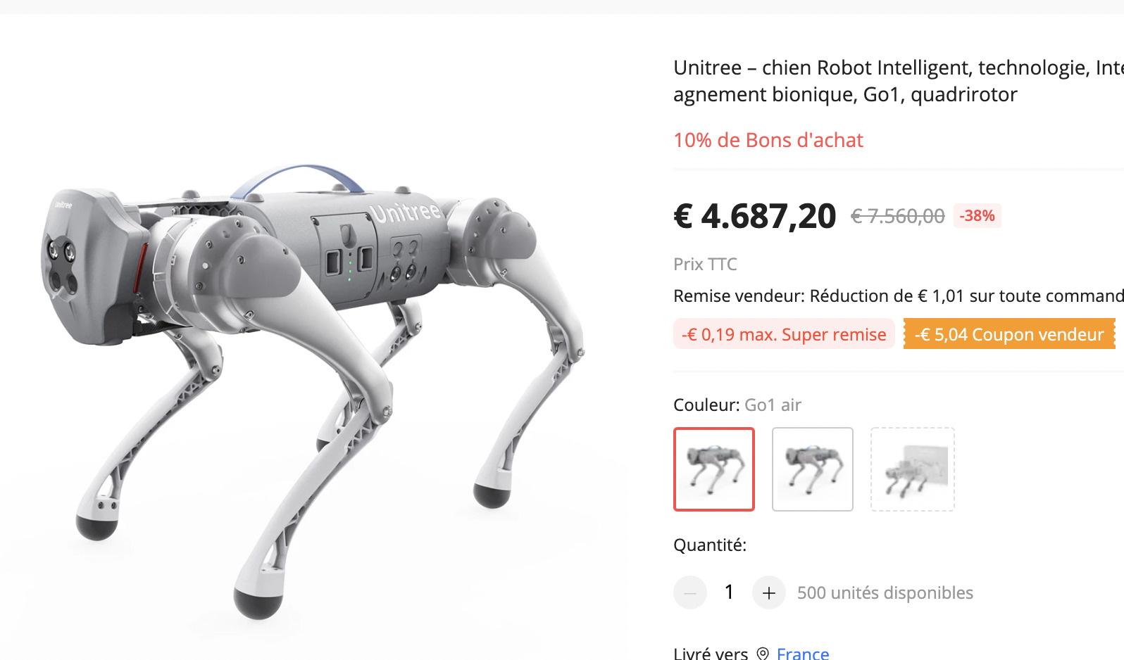 Problème : le robot n’est pas du tout développé par la société en question, mais par la startup chinoise Unitree. Sous le collant noir, se cache le modèle GO1 vendu pour 2 700 dollars (environ 2 650 euros) sur le site officiel et disponible sur la plateforme d’e-commerce AliExpress pour 4 687 euros. L’entreprise russe a probablement voulu dissimuler les éléments identifiables de la marque chinoise. Cette dernière s’est elle-même inspirée du fameux robot de Boston Dynamics, Spot, en vente dans le milieu professionnel.