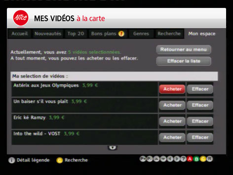 L’opérateur Alice propose désormais à ses abonnés de constituer depuis leur ordinateur une liste des vidéos « à la carte » qu’ils peuvent ainsi réserver et louer à distance, avant de les consulter sur leur téléviseur. Le service de VOD, qui sera probablement à terme proposé aux abonnés de Free lorsque la fusion sera effective, offre une navigation dans le catalogue beaucoup plus rapide et efficace qu’à la télécommande. Il permet aussi de louer les films depuis n’importe quel ordinateur, ce qui peut être utile aux parents qui souhaitent éviter de donner à leurs enfants le code d’identification qui permet d’accéder à tous les contenus payants ou protégés.