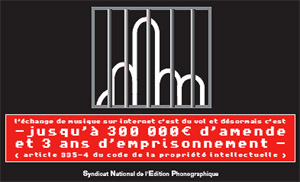 Ces deux affiches sont un avertissement avant l’arrivée des premières poursuites contre les internautes français, « si rien ne change » prévient Hervé Rony, directeur général du SNEP (le Syndicat National de l’Edition Phonographique). Autant les prévenir d’avance, rien ne changera. Autant donc vous prévenir d’avance, le SNEP lancera probablement ses premières poursuites judiciaires en septembre, là où tout le monde sera rentré de vacances pour entendre les nouvelles à la télévision.