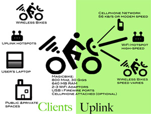 « Les vélos sans-fil se fondent dans la structure urbaine et apportent Internet dans des espaces et des communautés non encore desservies. Mélangeant l’art public et le techno-activisme, les Magicbikes sont parfaits pour mettre en place une connectivité Internet adhoc pour les évènements artistiques et culturels, les accès d’urgence, les démonstrations publiques, et auprès des communautés situées du côté pénible de la fracture numérique ».