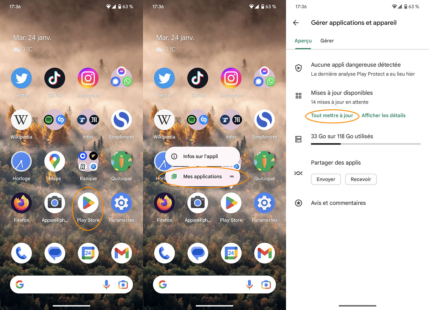 Notez que les mises à jour se téléchargent en principe automatiquement lorsque le smartphone est connecté en Wi-Fi et en cours de charge sur le secteur. Notez qu’en comparaison, la méthode classique consiste à cliquer sur l’application « Play Store », puis sur la vignette de son compte, puis « Gérer les applications et l’appareil », puis « Tout mettre à jour ». C’est ce chemin qui est raccourci ici.