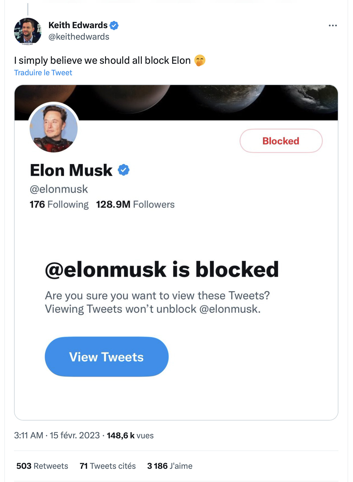 Comme de nombreux mouvements de boycott, #BlockElon ne devrait pas provoquer de rupture majeure. Sa seule utilité est de masquer les tweets d’Elon Musk si vous n’en pouvez plus, puisqu’un blocage aura pour effet de cacher le compte du milliardaire. Il ne concernera que votre fil d’actualité, ce qui veut dire qu’Elon devrait pouvoir continuer de dormir tranquillement (à moins que 100 millions de personnes ne le bloquent).