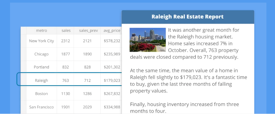 Dans l’exemple donné par Wordsmith, une agence immobilière qui voudrait écrire le magazine qu’elle offre à ses clients n’aurait plus besoin de s’embêter à écrire des dizaines d’articles. L’intelligence artificielle, à partir des données fournies par le client, saura utiliser les bonnes formules pour transformer des chiffres en un article à la forme somme toute très acceptable. Plus encore, elle pourra, en quelques secondes, écrire un article pour chaque ville couverte par l’agence.