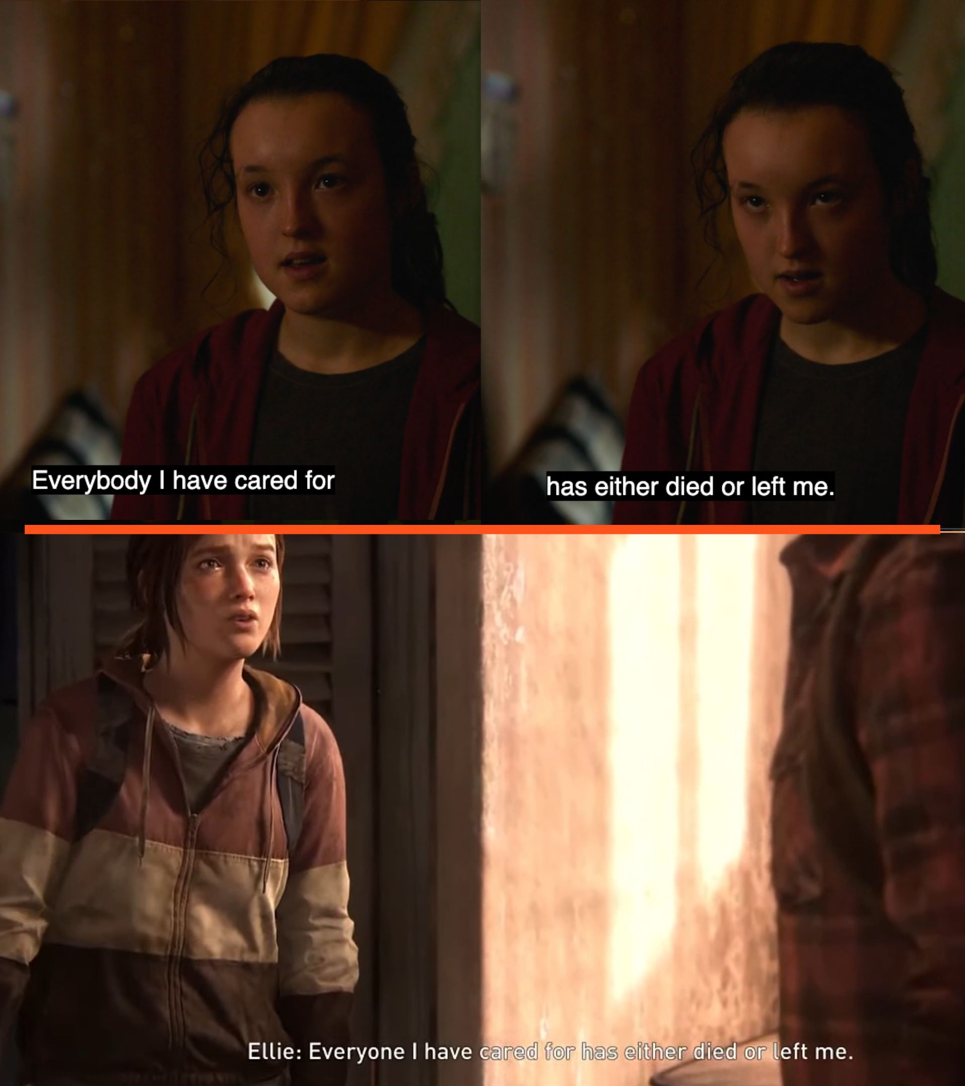 Le contexte est légèrement différent dans la série, puisque, dans l’adaptation, Ellie ne s’enfuie pas. Cependant, on la retrouve tout de même dans une chambre, assise sur un banc de fenêtre, en train de lire. Puis l’intégralité du dialogue est la même que dans le jeu. Au mot près et presque à la virgule près.