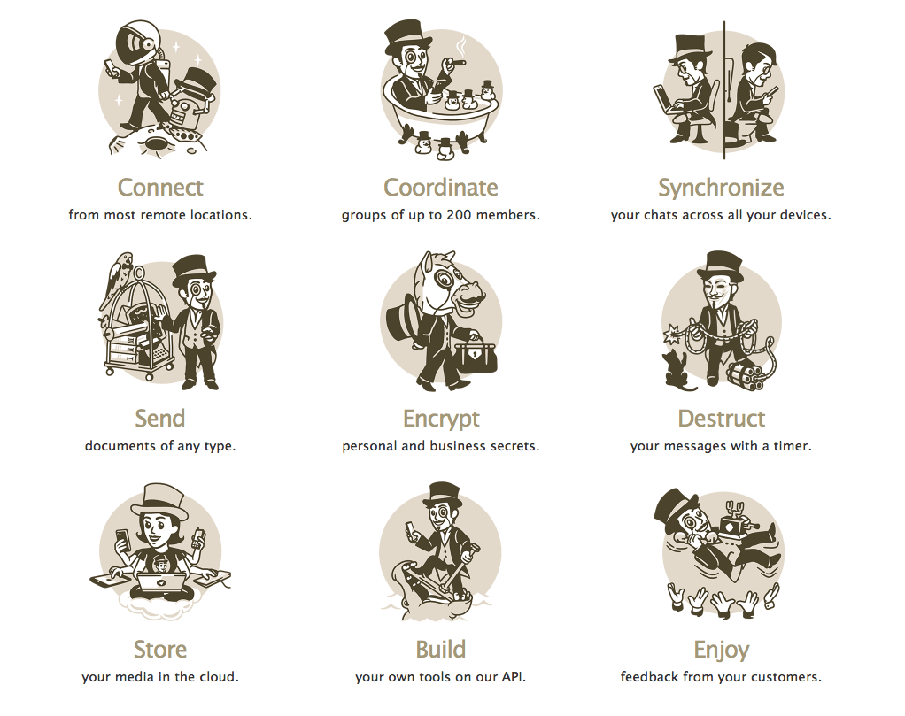 On note dans le lot qu’il est possible de chiffrer ses communication (l’application utilise un protocole end-to-end EE2E, qui garantit un chiffrement des messages de client à client et non uniquement du serveur au client), de programmer des messages qui s’auto-détruisent, d’envoyer des documents et surtout, de créer des conversations de groupe qui bénéficient de toutes ces options jusqu’à 200 personnes. Très largement de quoi réunir une cellule terroriste pour transmettre de la propagande ou un groupe qui aurait décidé de planifier une attaque, d’autant que l’application ne demande pas de nom d’utilisateur pour être utilisée : des salons Telegram liés à Daesh auraient déjà été repérés par le groupe Anonymous.