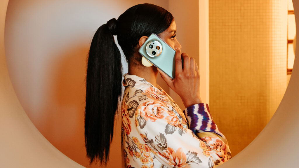 Posé sur une table au milieu d’autres téléphones, le Honor Magic5 Pro ne manque pas de se démarquer avec son esthétique unique. Son module dorsal circulaire, inspiré par les travaux de l’architecte espagnol Antoni Gaudi, fait parfaitement corps avec le dos du téléphone, ce qui lui confère un cachet unique.