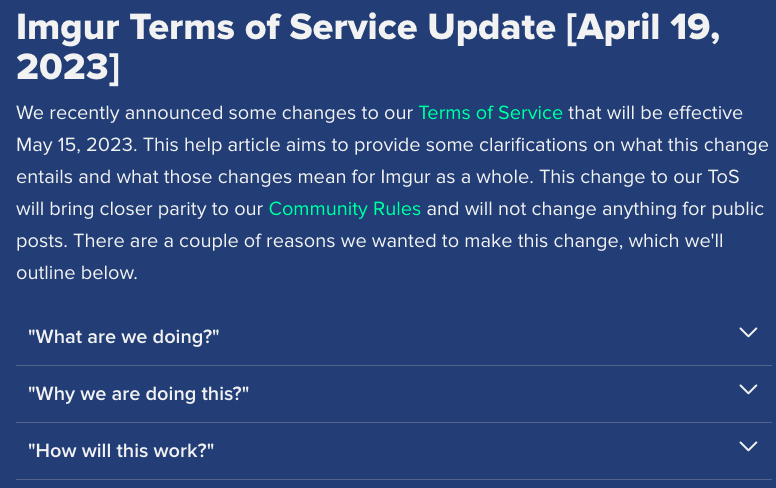 Dans une mise à jour de ses conditions d’utilisations du 19 avril, Imgur a en effet annoncé « retirer de la plateforme le contenu ancien, inutilisé et inactif qui n’est pas lié à un compte d’utilisateur, tout comme la nudité, la pornographie, et le contenu sexuellement explicite ». Les utilisateurs ont jusqu’au 15 mai 2023 pour sauvegarder leurs données.