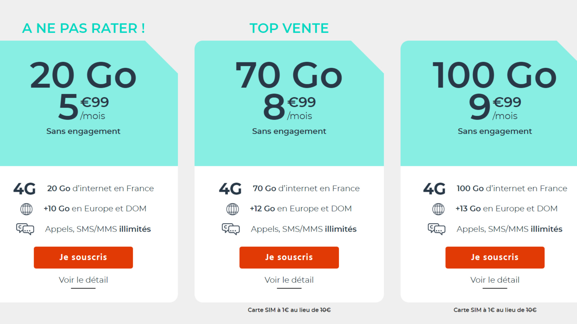 Les forfaits proposés par Cdiscount sont tous des bonnes affaires. Celles et ceux qui n’ont pas besoin d’un gros volume de données peuvent, par exemple, se tourner vers le forfait 100 Go de 4G, à moins de 10 € par mois. Pour situer Cdiscount Mobile parmi la concurrence, consultez notre guide des meilleurs forfaits mobiles du moment.