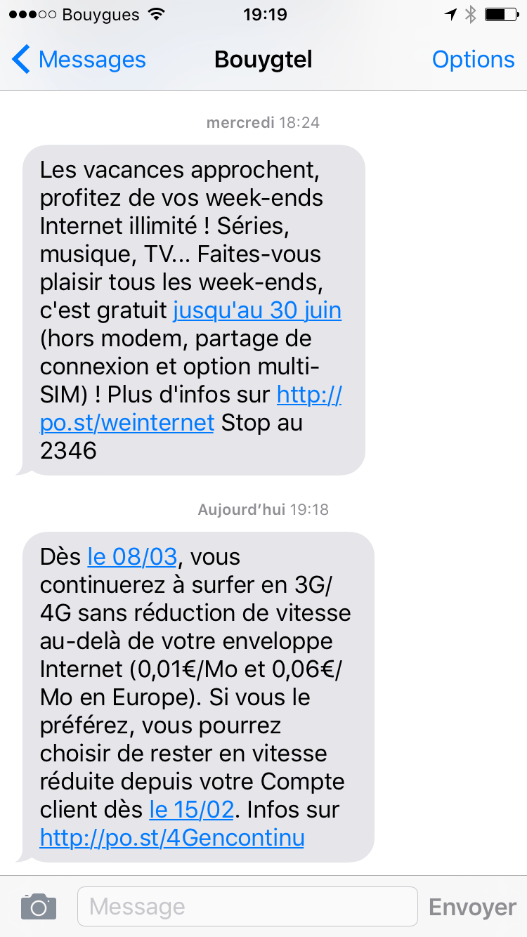 Car oui, il est possible de rester sur le mode de consommation actuel et d’avoir un débit bridé après avoir dépassé votre quota, le tout gratuitement. Si vous ne souhaitez pas payer de hors forfait, c’est précisément ce que vous devriez faire — quitte à désactiver ce mode dans votre compte le jour où vous aurez besoin de plus de débit. Comme le changement de mode sera effectif dès le 15 de ce mois, Bouygues a commencé à envoyer des SMS à ses abonnés pour les prévenir des changements. Ils prendront effet au renouvellement de votre forfait après le 15 février.