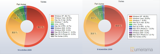 Parmi les lecteurs de Numerama sur l’ensemble du site (donc y compris sur la chaîne de téléchargements et le comparateur de prix), Windows 7 représente déjà 8,5 % des visiteurs, devant Linux qui reste à 3,4 %, et devant Mac OS X (5,3 %). Il y a un mois, le 10 octobre (deux jours avant sa sortie officielle), Windows 7 était déjà utilisé par 5,4 % de nos visiteurs.