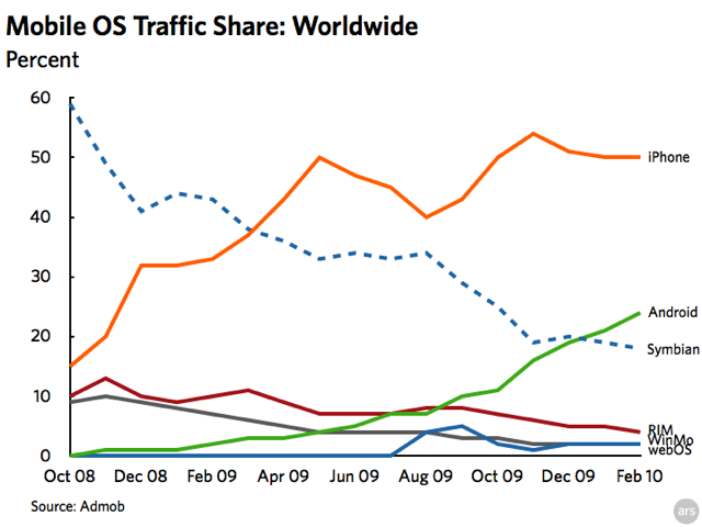 Aux États-Unis, les derniers chiffres connus (au mois de février 2010 – .pdf) récoltés par Admob montrent une tendance nettement favorable pour Android, tandis que son grand rival connait une importante phase de déclin depuis six mois. Un déclin qui reste à relatif, puisque Apple détient encore une bonne moitié du marché américain. Dans le reste du monde en revanche, l’iPhone OS continue de dominer les débats avec une part de marché aux alentours de 50 %, tandis que ses principaux rivaux, Android et Symbian, sont nettement sous la barre des 25 %.