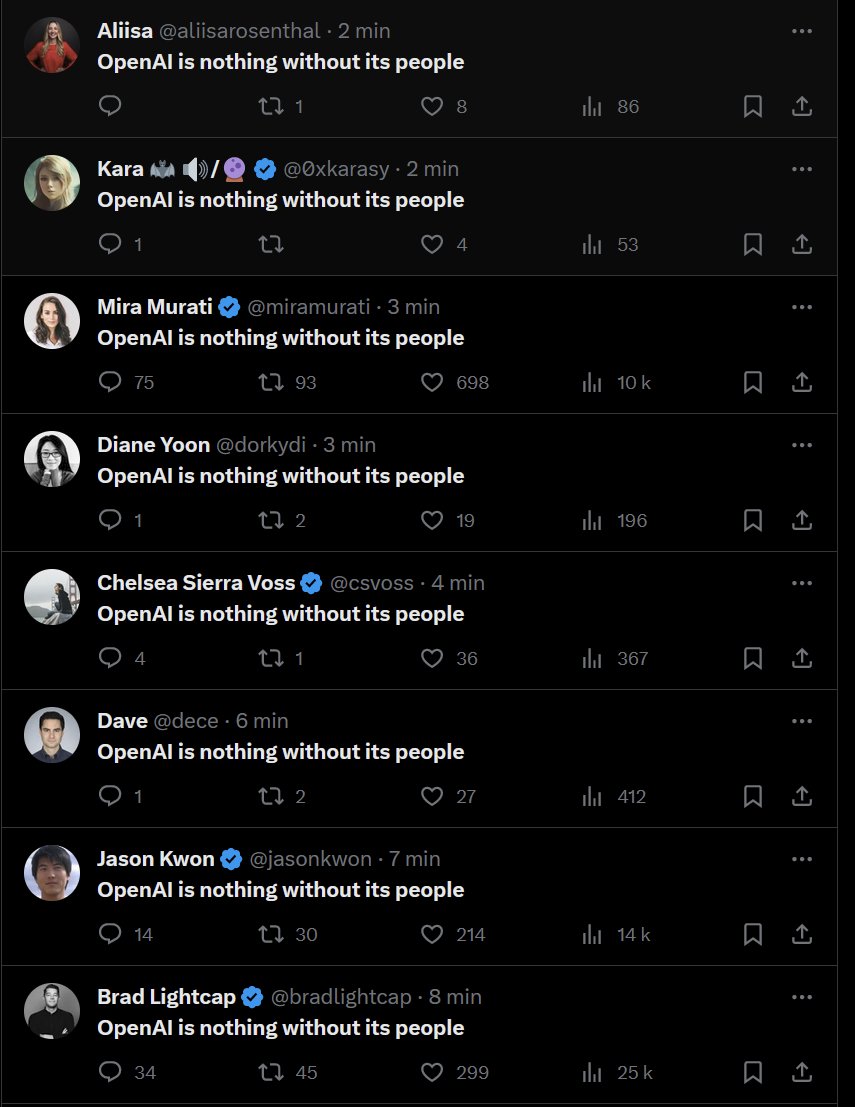 Dans les heures qui ont suivi la « chute » de Sam Altman, plusieurs employés d’OpenAI, souvent retweetés par Sam Altman, ont partagé le même message : « OpenAI is nothing without its people ».