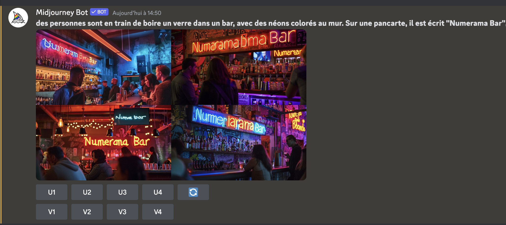« Censée », puisque nos premiers essais sont imparfaits. Avec des prompts en anglais ou en français, nous n’arrivons que très rarement à lui faire générer notre nom (Numerama). « Numerana », « Numaramabma », « Numerams »… Il y a du mieux, mais Midjourney n’est pas encore infaillible en la matière. En revanche, en s’y reprenant à plusieurs fois, il est fortement probable que l’on arrive à lui faire écrire un texte précis.