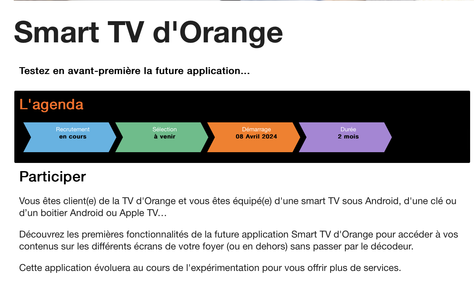 Depuis le 25 mars 2024, l’opérateur propose sur son site Le Lab (ex-Lab Orange) de s’inscrire à une expérimentation dénommée « Smart TV d’Orange ». La description ne laisse aucun doute : « Vous êtes client(e) de la TV d’Orange et vous êtes équipé(e) d’une smart TV sous Android, d’une clé ou d’un boitier Android ou Apple TV… Découvrez les premières fonctionnalités de la future application Smart TV d’Orange pour accéder à vos contenus sur les différents écrans de votre foyer (ou en dehors) sans passer par le décodeur. »