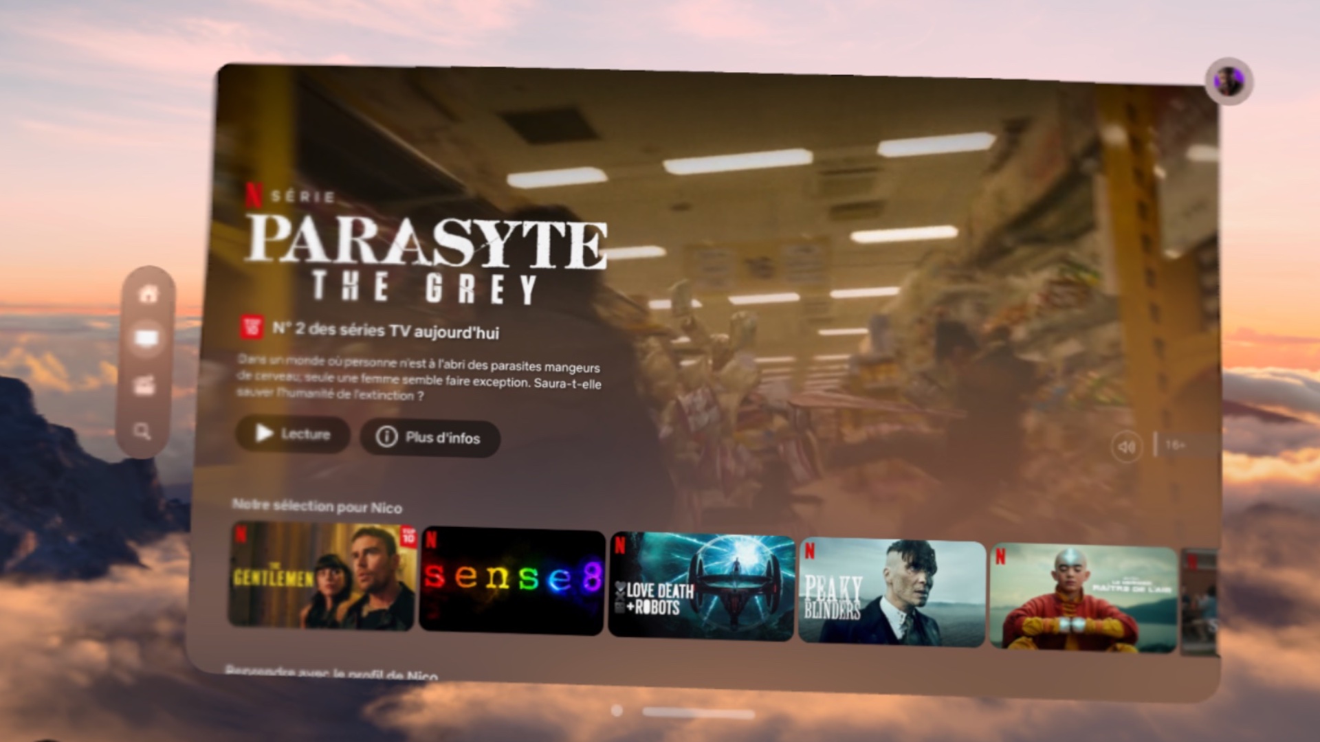 L’interface de Supercut est extrêmement propre, avec une bonne utilisation de la transparence de visionOS. Le profil en cours d’utilisation flotte en haut à droite de l’application, ce qui renforce l’impression d’utiliser une application native. La possibilité d’accélérer une vidéo, de changer sa langue ou de la redimensionner dans la taille de son choix, sans aucune limite et sans aucune bande noire, est aussi extrêmement plaisante. Supercut rend la consommation de Netflix et de Prime Video sur un Apple Vision Pro aussi agréable qu’Apple TV+, Disney+, Max ou myCANAL, les services disponibles nativement.