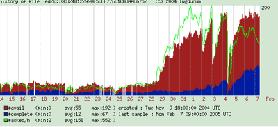 Sur les réseaux P2P en général, la mort de Jacques Villeret a immédiatement provoqué un regain d’intérêt pour des films laissés quasiment à l’abandon jusqu’à ce jour du 28 janvier. Demandé au téléchargemnet à peine plus de deux fois par heure, le film Un crime au Paradis avec Josianne Balasko et André Dussolier a soudainement connu un taux de plus de 550 demandes par heure sur le seul serveur Razorback du réseau eDonkey. L’effet est spectaculaire :