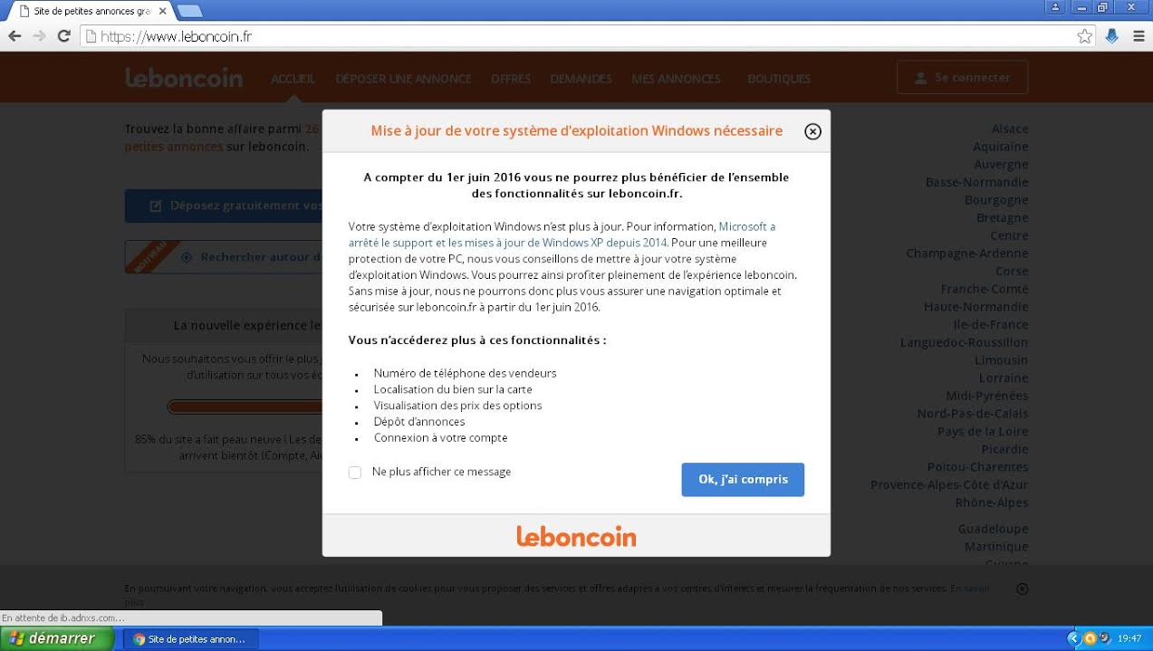 C’est dans un message laconique que le site de vente de particuliers à particuliers méconnu de Nicolas Sarkozy présente la nouvelle à ses visiteurs : le premier juin, ils ne pourront plus accéder aux fonctionnalités essentielles du site s’ils sont sous Windows XP. Le numéro de téléphone des vendeurs, la localisation des biens sur la carte, la visualisation des prix des options, le dépôt d’annonces et la connexion à votre compte seront inaccessibles si vous allez sur LeBonCoin avec le vieillissant système d’exploitation de Microsoft.
