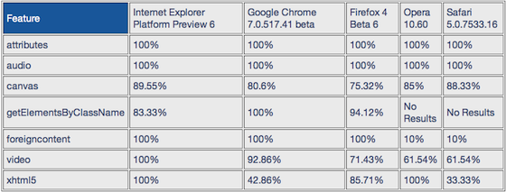Pour réaliser ce comparatif, le WorldWide Web Consortium a sélectionné les dernières versions des navigateurs web. Ainsi, la « Platform Preview 6 » d’Internet Explorer 9 était confrontée à Google Chrome 7.0.517.41 beta, Firefox 4 Beta 6, Opera 10.60 et Safari 5.0.7533.16. Si l’ensemble de ces navigateurs obtient 100 % dans les catégories attributs et l’audio, les notes se dispersent ensuite en fonction des navigateurs et des catégories. Dans certains cas, il n’y a même aucune note.
