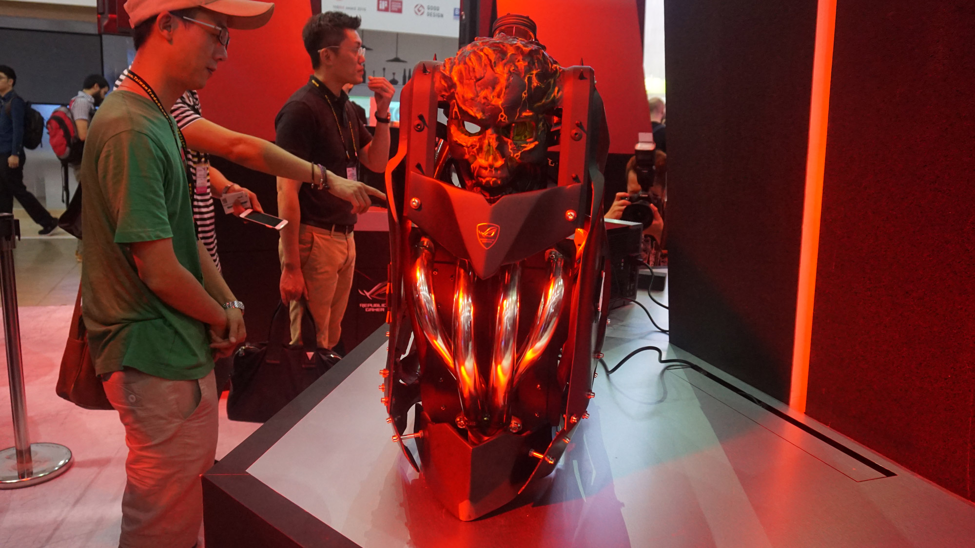 Pour les 10 ans de sa gamme Republic of Gamers, Asus avait sur son stand un PC beaucoup trop rouge pour notre appareil photo, mais parfaitement dans le ton de sa série. Idéal pour transformer une paisible piaule en repère lugubre, mais cela risque de mal s’accorder avec des meubles vintage.
